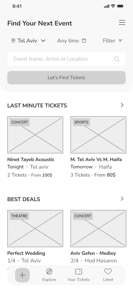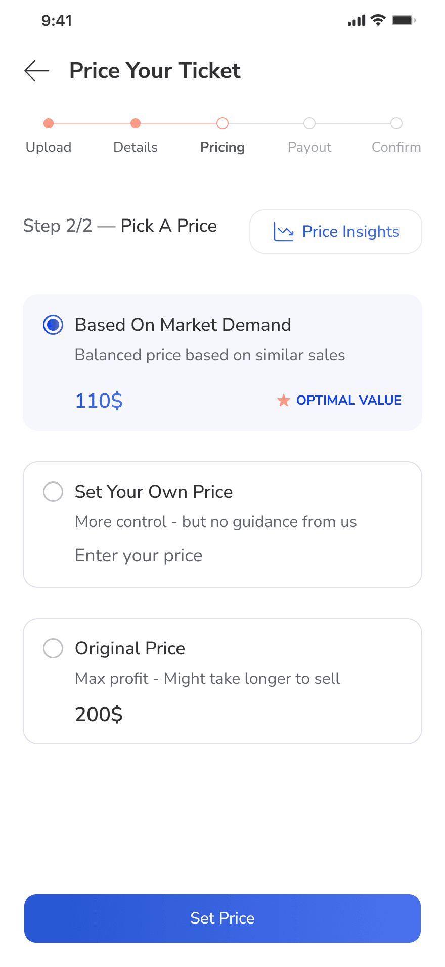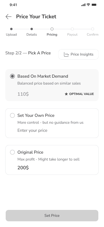 Instead of a single rigid flow, the experience is built around several lightweight but connected journeys, each focused on a key moment: listing a ticket, buying one, or simply exploring what’s available.